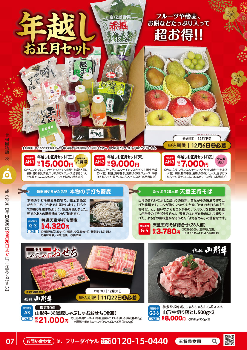 年越し正月セット、手打ち蕎麦、天童王将そば、山形牛切り落とし、山形牛・米澤豚しゃぶしゃぶおせち(7P)