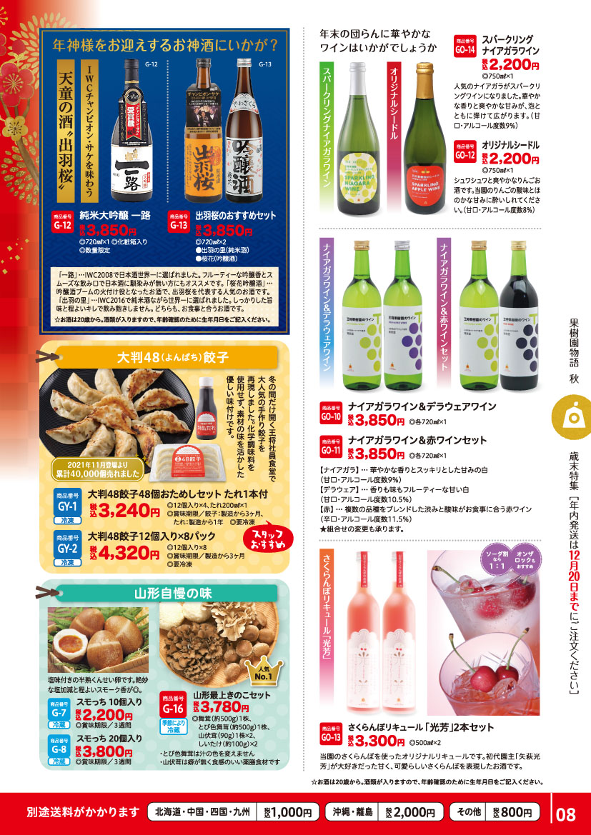 出羽桜、大吟醸一路、大判48餃子、スモっち、ナイアガラワイン、赤ワイン、デラウェアワイン、シードル、リキュール(8P)