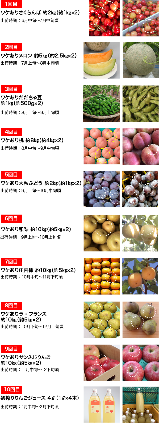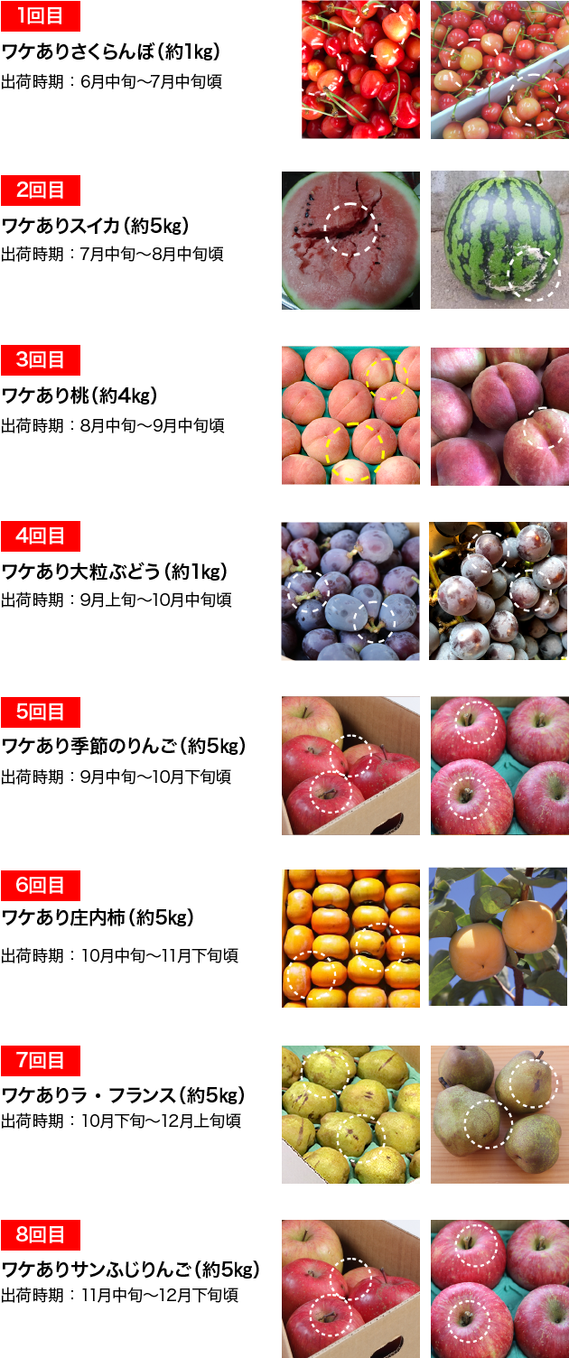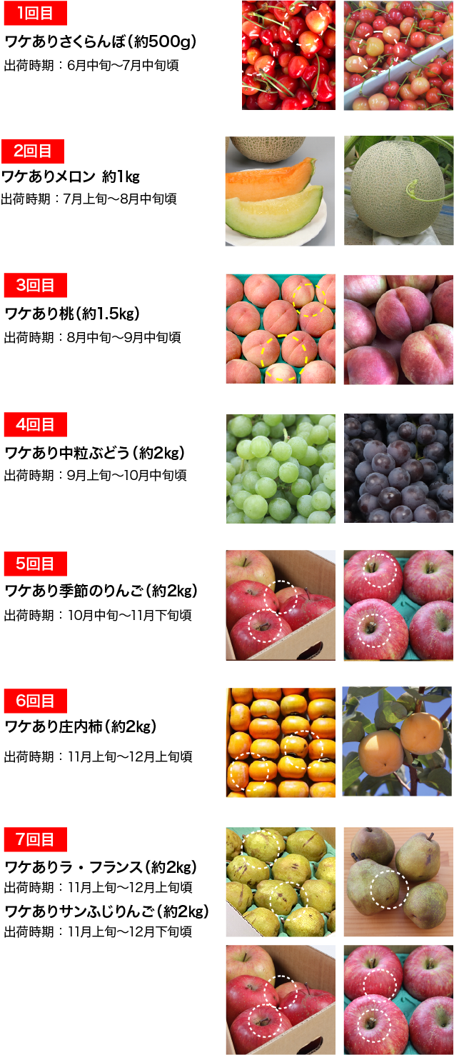 「ワケあり倶楽部」は、定額で色々なワケありくだものを「一番おいしい時期に」食べられる、山形発のフルーツ頒布会です。